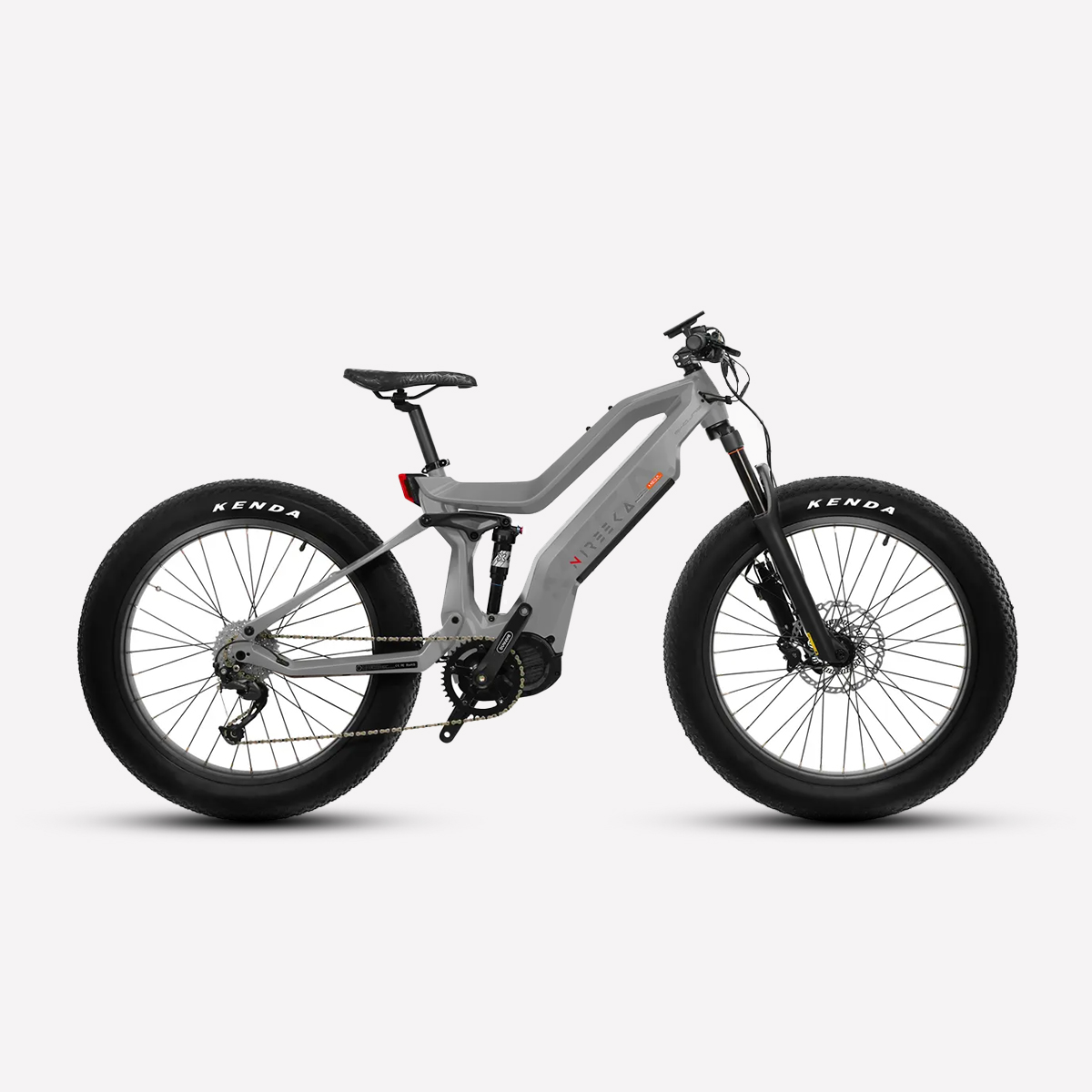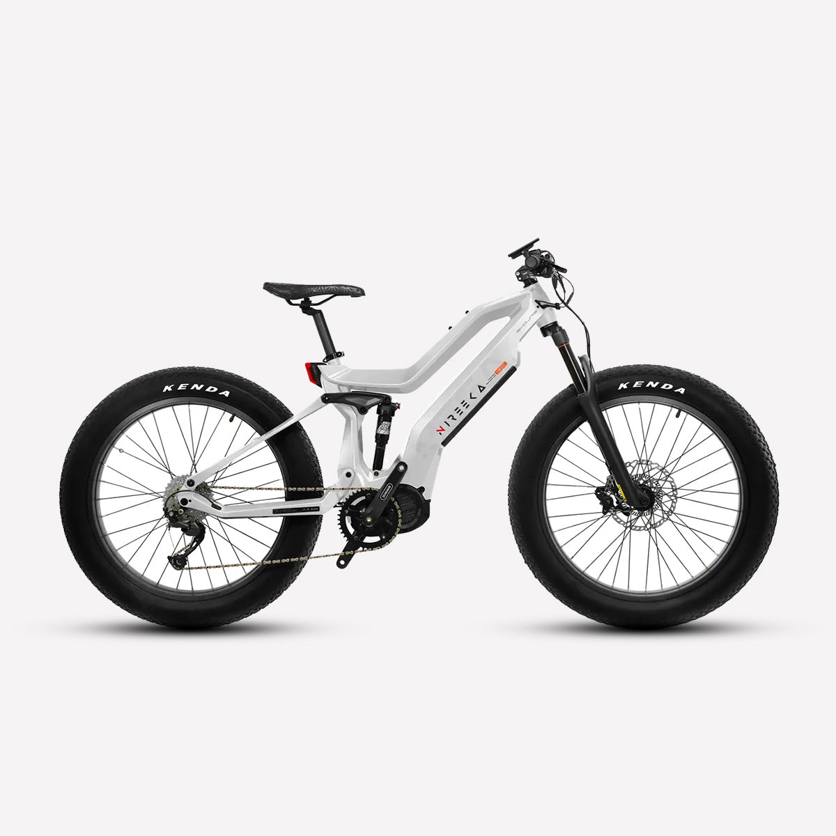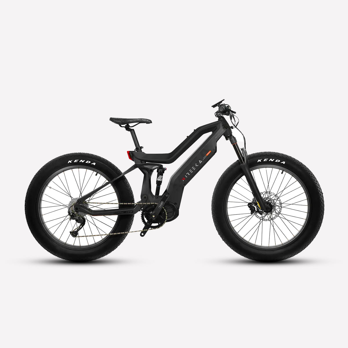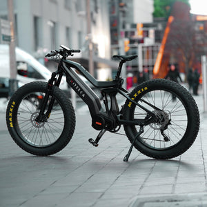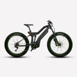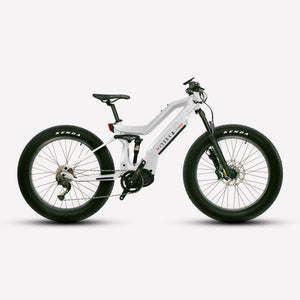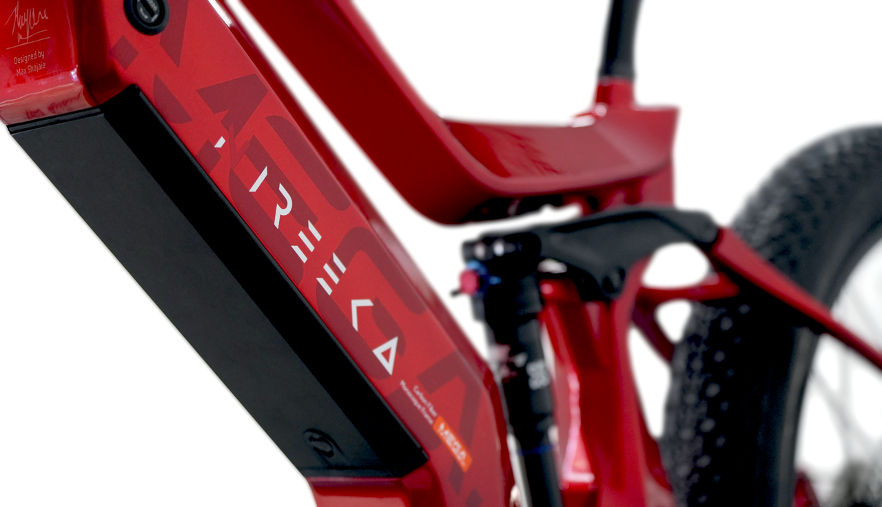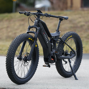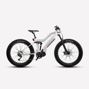 Lightweight carbon fiber frame, Mid-drive powertrain layout, Internal removable battery, 26"x4" fat tires front and rear, 160nm of torque, Front and rear suspension.