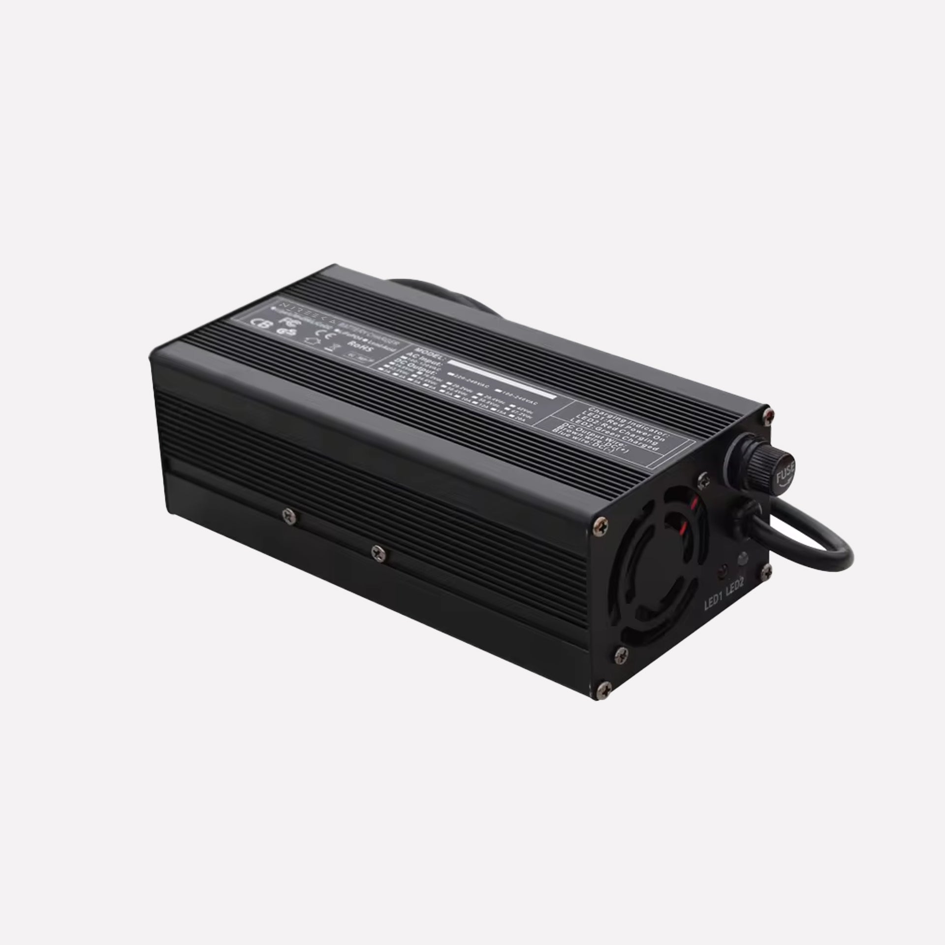 Reduce your charging time by up to 2.5X compared to our Normal Charger. Our high-performance charger is designed for safety and efficiency, featuring a cooling fan and a durable aluminum enclosure to prevent overheating. It includes two LED indicators for clear charging status, supports a wide voltage range of 100 to 240V, and is equipped with protective fuses along with spare fuses for added security. This charger offers reliable performance, whether at home or on the go.