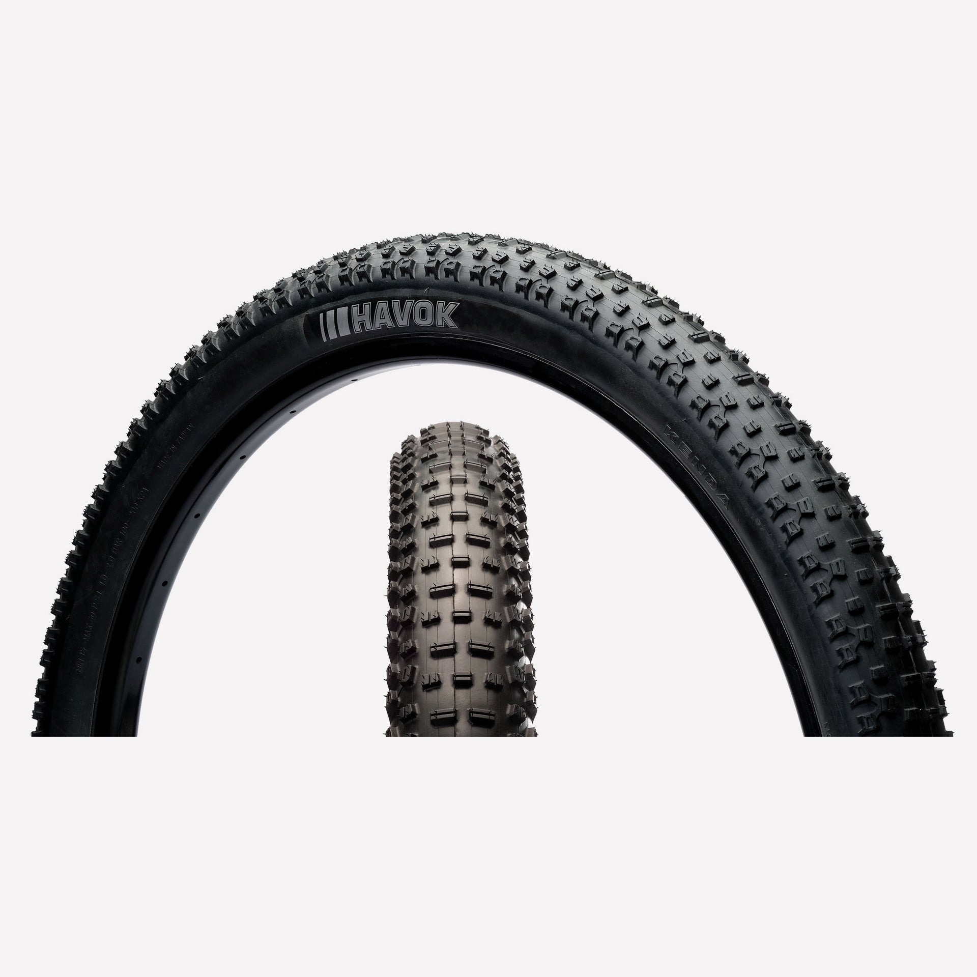 The Kenda Havok is a plus-sized mountain bike tire designed to enhance ride quality and performance across various trail conditions. Its increased air volume and contact patch, combined with an open tread pattern, offer a balance of speed and grip. Low-profile center blocks ensure quick-rolling, while siped transition knobs and shoulder blocks provide traction on diverse terrains. The tire is tubeless-ready, allowing for reduced weight and improved rolling performance. Additionally, certain models are optimized for e-mountain bike riding, featuring the E-Mountain Casing (EMC) for enhanced durability and control.