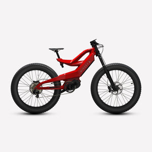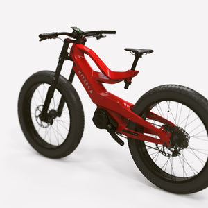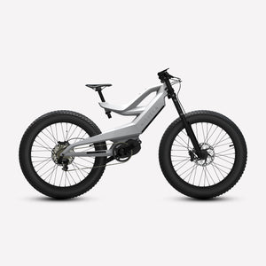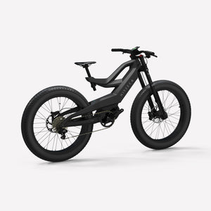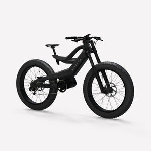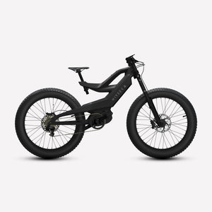 Lightweight carbon fiber frame, Mid-drive powertrain layout, Internal removable battery, 26"x4" fat tires front and rear, 160nm of torque